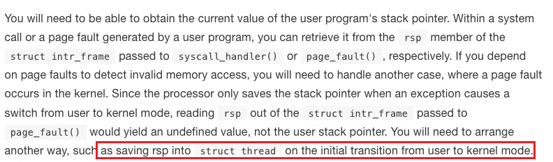 bool vm_try_handle_fault (struct intr_frame *f UNUSED, void *addr UNUSED, bool user UNUSED, bool write UNUSED, bool not_present UNUSED) { ... if (not_present) { void *rsp = f->rsp; if (!user) rsp = thread_current()->rsp_stack; if ((USER_STACK - (1 << 20) <= rsp - 8 && rsp - 8 == addr && addr <= USER_STACK) || (USER_STACK - (1 << 20) <= rsp && rsp <= addr && addr <= USER_STACK)) vm_stack_growth(addr); ... } return false; }void *rsp = f->rsp; - user access의 경우 rsp는 유저 stack을 가리킨다. if (!user) rsp = thread_current()->rsp; - kernel access인 경우 thread에서 rsp를 가져와야 한다. vm_stack_growth(addr); - 스택 확장으로 처리할 수 있는 폴트인 경우, vm_stack_growth를 호출한다.